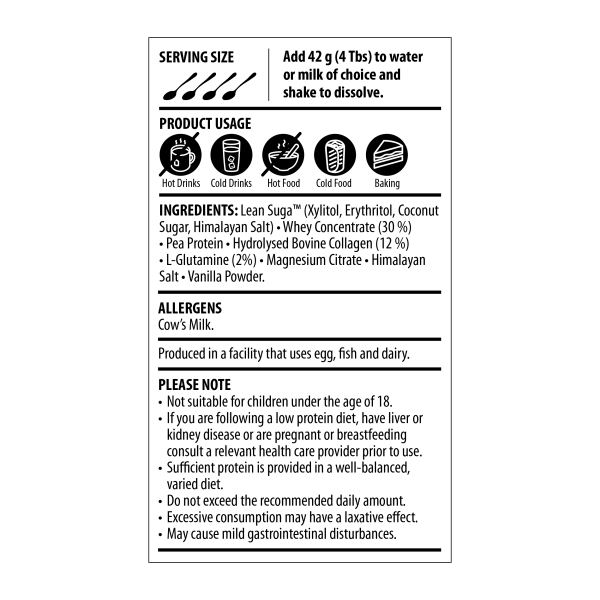 Whey concentrate (30%), hydrolysed collagen (bovine)(12%), Lean Suga (xylitol, erythritol, coconut sugar, himalayan salt), Pea Protein, Vanilla powder, l-glutamine(2%), magnesium citrate, himalayan salt